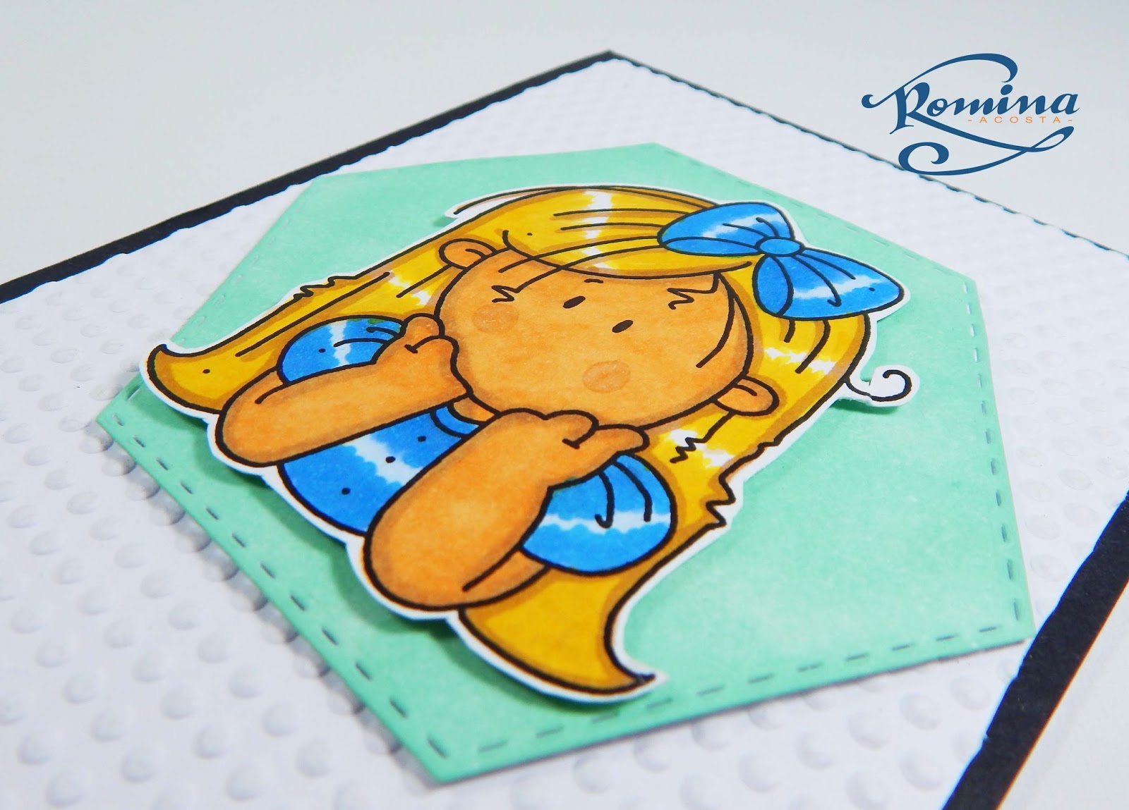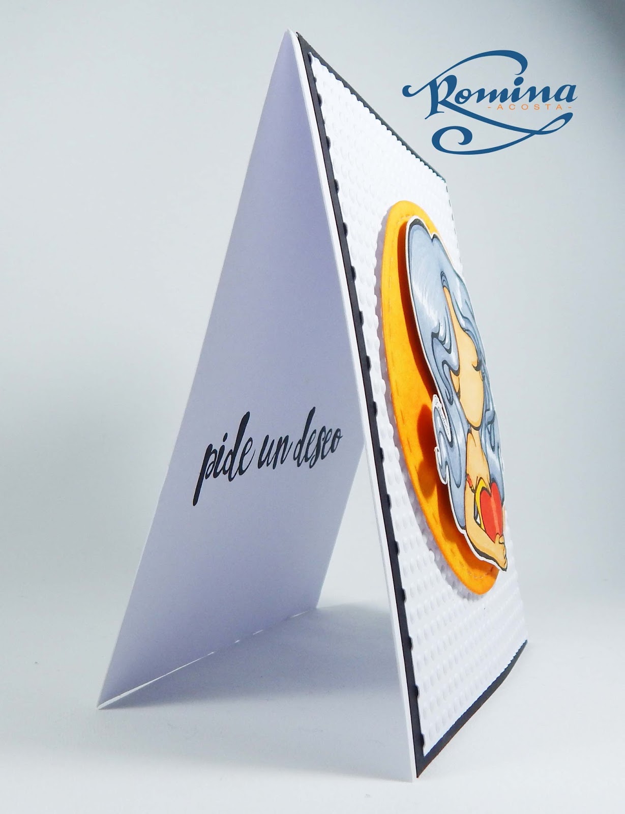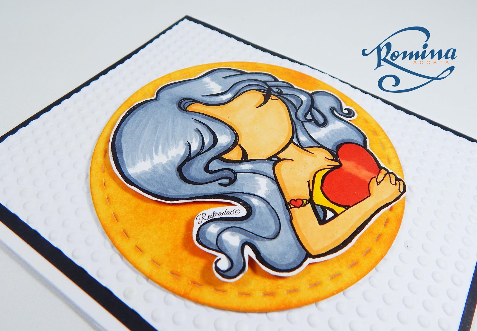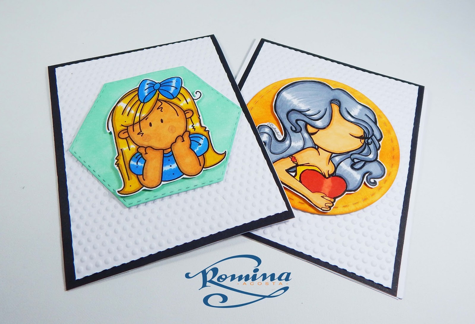 Con la sizzix use una carpeta de embossing para darle relieve al papel que utilice como fondo de la tarjeta. Para darle un marco y resaltar el diseño simple use una capa de papel de 180 gr negro de Canson (papel que amo!!). Troquele unas figuras las cuales aplique tinta distres ink para darle color a las tarjetas. Coloque como imagen digis de Lostanhell Creations y Bugadoo stamp. A ambas figuras las pegue con cinta con relieve para dejarlas como diseño principal de la tarjeta. En este caso son digis que ya tenían tiempo pintados y decidí usarlos.